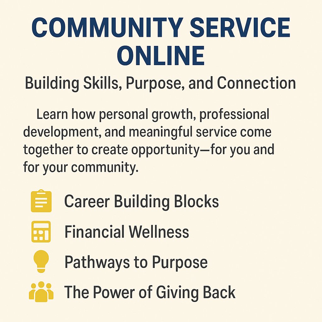 What You’ll Learn:  ✅ Career Building Blocks – Resume creation, job interview prep, and workplace readiness skills  ✅ Financial Wellness – Budgeting, managing expenses, and setting future goals  ✅ Pathways to Purpose – Discovering careers in coaching, education, and community-focused work  ✅ The Power of Giving Back – How service enhances emotional well-being, social connection, and professional reputation  ✅ Empowerment Through Action – Understanding how community work builds confidence, structure, and long-term opportunity