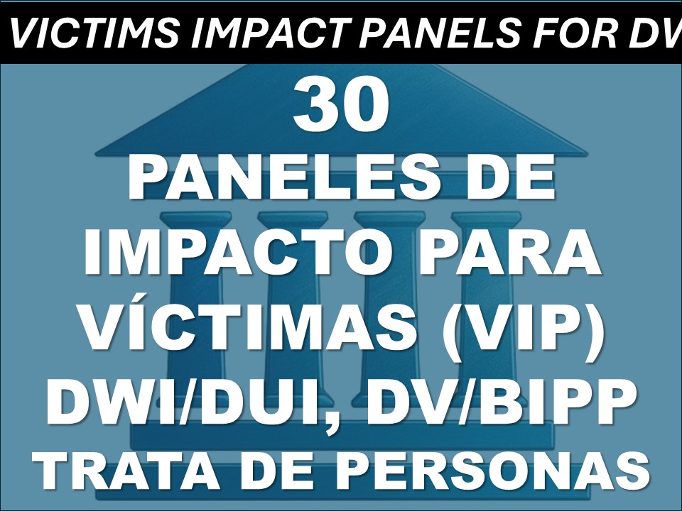 Paneles de Impacto para Víctimas: Clases de 2, 4, 6 y 8 horas diseñadas para compartir historias de sobrevivientes de DUI, violencia doméstica y trata de personas, sexual y laboral, y para fomentar una perspectiva compasiva sobre la importancia de ser humano y el valor de ser humano. Incluye comprobante de inscripción, cuaderno de ejercicios opcional y certificado instantáneo.