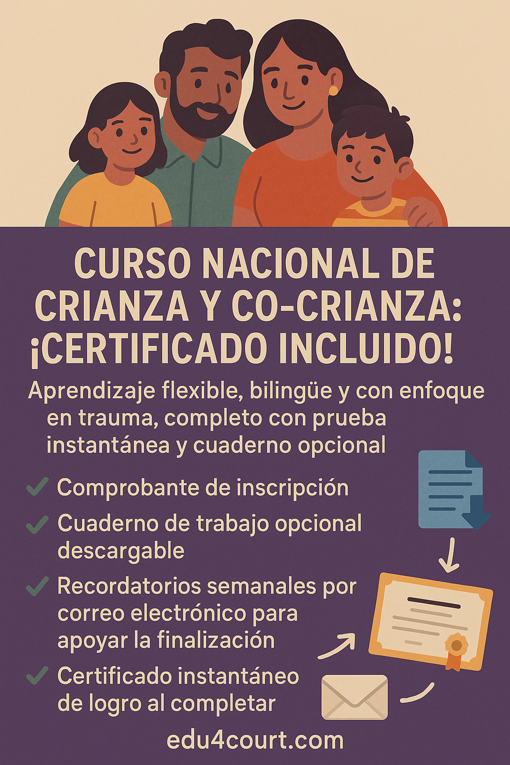 Clase certificada en línea diseñada para enseñar crianza consciente, coparentalidad cooperativa y efectiva, estabilización familiar y disciplina infantil consciente, positiva y enriquecedora. Incluye comprobante de inscripción, cuaderno de ejercicios opcional, sesiones de preguntas y respuestas, recordatorios por correo electrónico y certificado instantáneo.