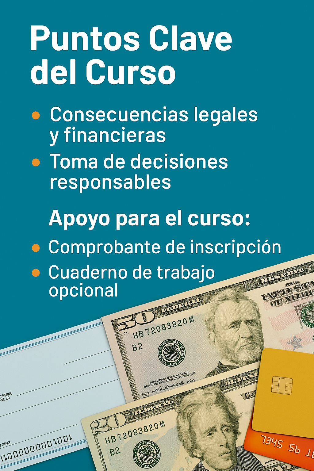 Los errores financieros—sean intencionales o accidentales—pueden tener serias consecuencias legales. Este curso está diseñado para educar a los participantes sobre las realidades del robo mediante cheques, cheques sin fondos (NSF), cheques calientes y fraude con tarjetas de crédito, promoviendo decisiones responsables y un cambio de comportamiento sostenible.