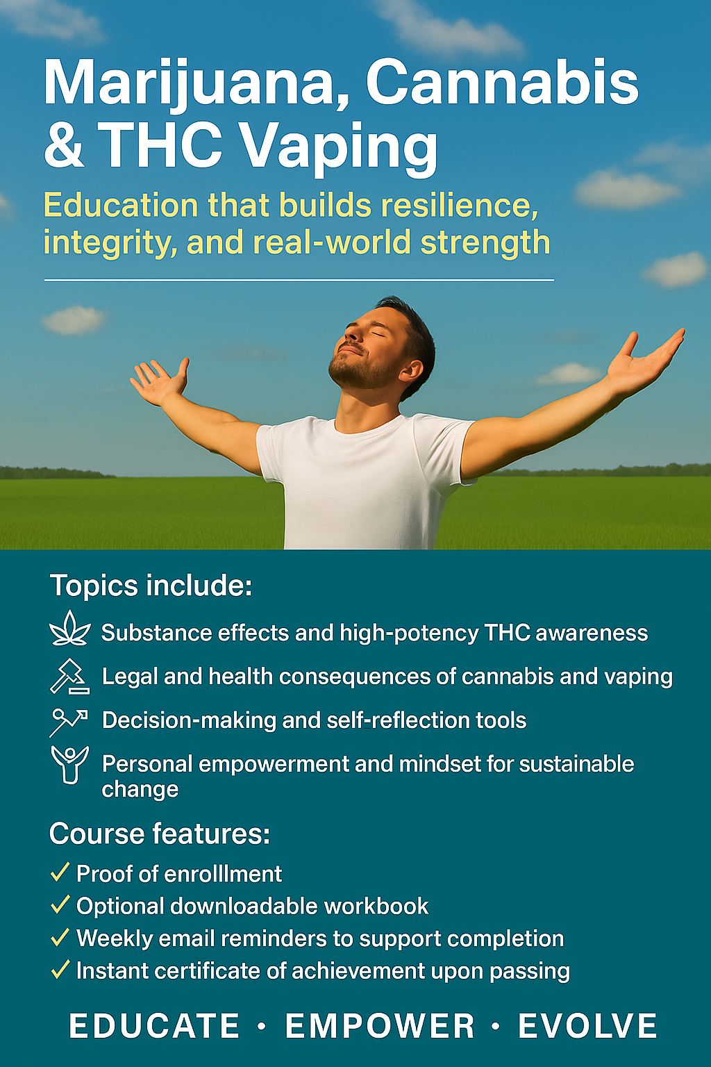 Whether you're fulfilling a court mandate, participating in probation, completing a school-related suspension alternative, or investing in personal growth, our certified Marijuana, Cannabis & THC Vaping course offers practical, judgment-free tools for long-term success.
